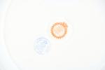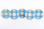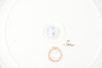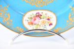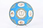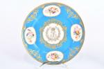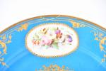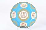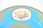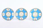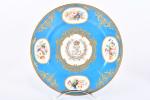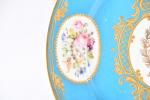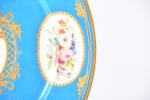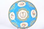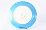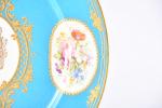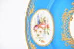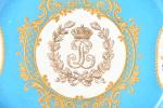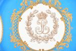 SEVRES. Partie de service (cinq assiettes) en porcelaine à décor polychrome, monogrammé "L.P. (Louis-Philippe)". Sur décoré de cartouches, de fleurs polychromes et monogramme au centre dans des réserves sur fond bleu et doré. Marque au revers du château des Tuileries et de Sèvres des années 1844 (quatre) et une 1846. Infimes usures au bleu de l'une et l'une avec un morceau recollé sur le pourtour. Diam. 24,5 cm.
