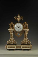 PENDULE (grande) portique en marbre blanc et noir, beau décor de bronze ciselé et doré à pampres, rinceaux, lyres et rosaces, agrémentée de médaillons en biscuit de Wedgwood, cadran émaillé blanc signé "Robinet à Paris", mouvement à fil. Epoque Louis XVI. H. 54 cm - L. 38,5 cm (balancier postérieur) ; Lot vendu sur folle enchère