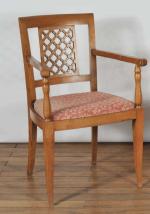 FAUTEUIL en merisier patiné naturel à dossier ajouré à décor de croisillons reposant sur quatre pieds fuselés. H. 88 cm