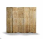 Paravent à cinq volets articulés entièrement gainé de parchemin sur piètement plein en retrait et patins de silence (petits manques et déchirures).