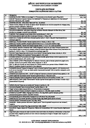 Les indications portées sur le catalogue seront établies par « Hôtel des Ventes de Besançon » avec la diligence requise pour une société de ventes volontaires de meubles aux enchères publiques, sous réserve des rectifications affichées dans la salle de vente ou de celles annoncées par Maitre Renoud-Grappin lors de la présentation du lot et portées sur le procès-verbal de la vente. Les indications sont établies compte tenu des informations données par le vendeur, des connaissances scientifiques, techniques et artistiques et de l'opinion généralement admise des experts et des spécialistes, existantes à la date à laquelle lesdites indications sont établies.