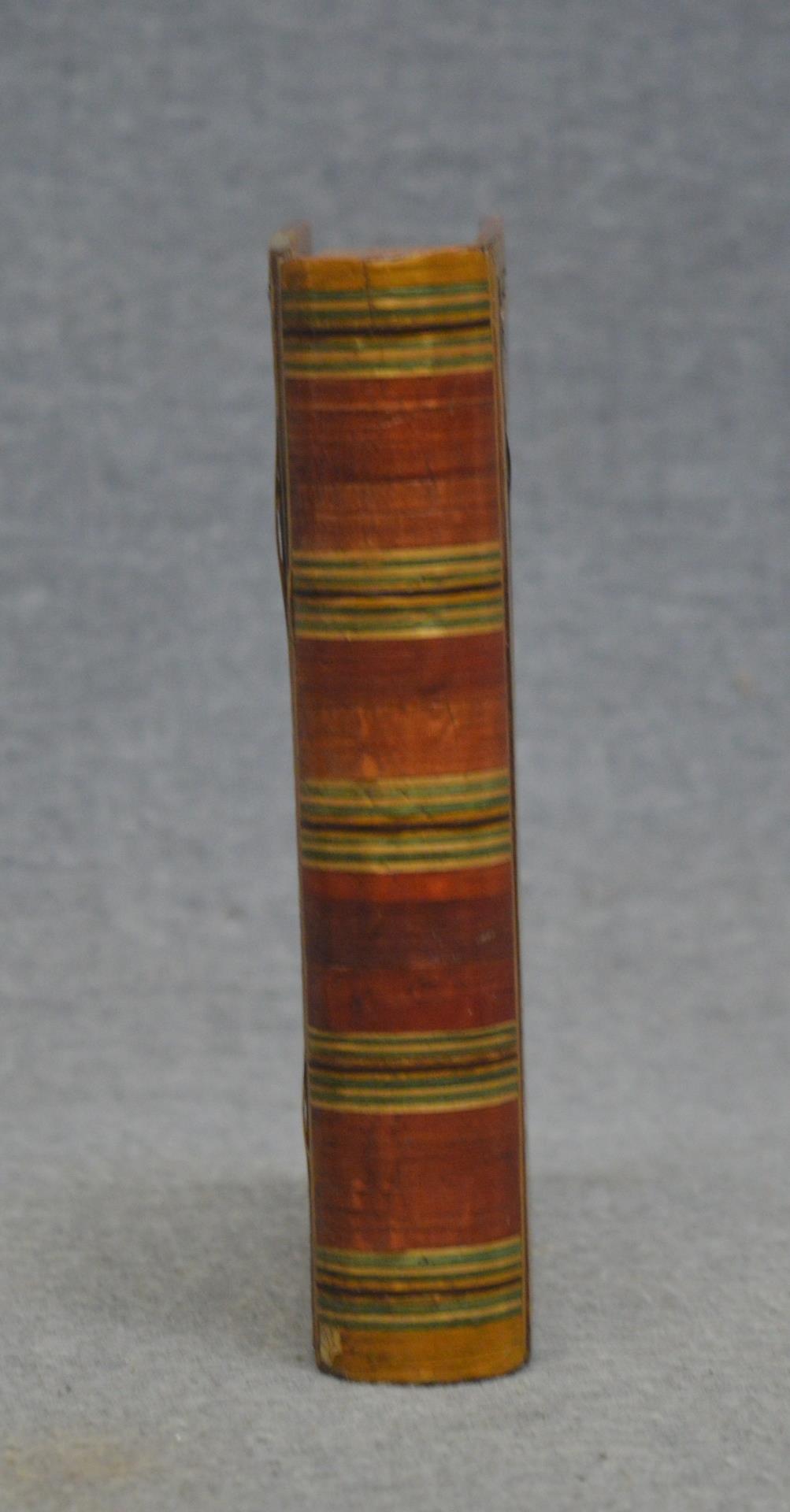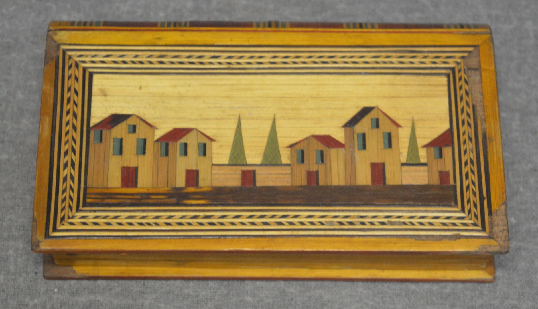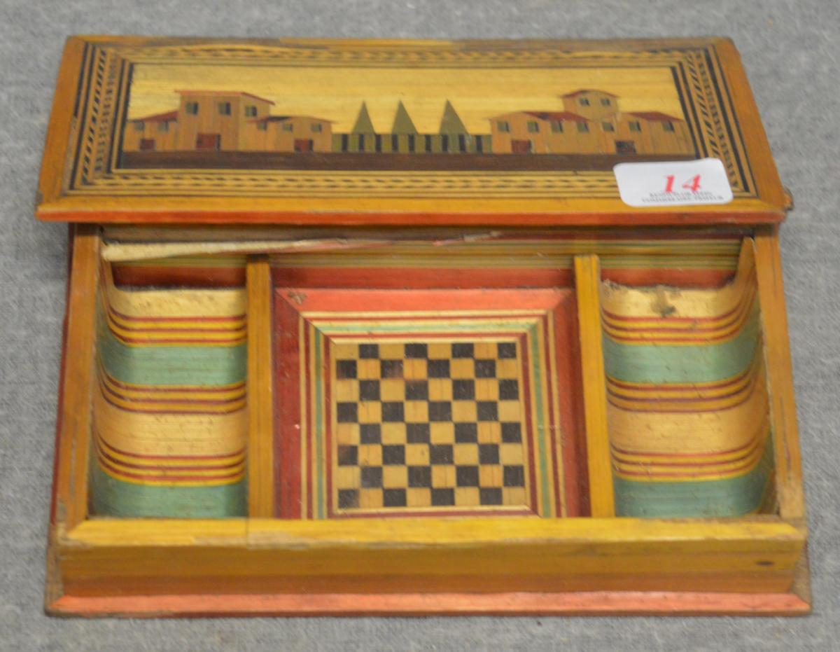 MARQUETERIE DE PAILLE : boîte de jeu simulant un livre, les 2 plats à décor de maison; l'intérieur formé d'un échiquier (accidents et manques) l = 14, 7, p = 8, 3, épaisseur = 3. Epoque XIXe