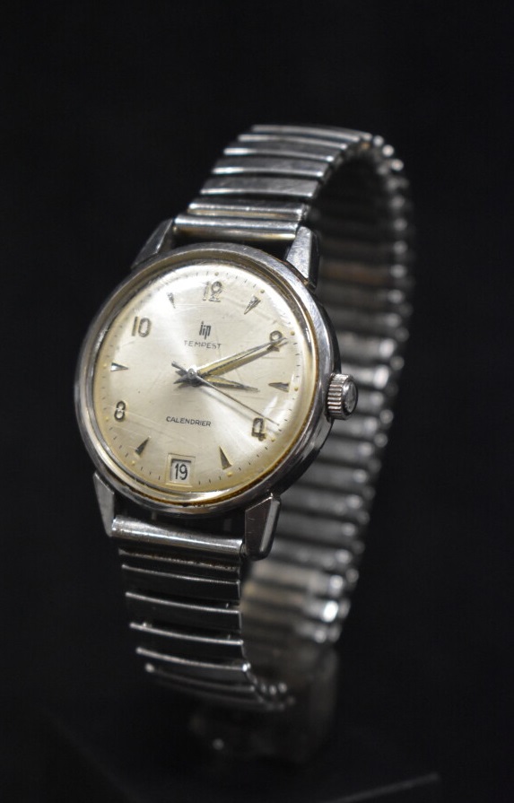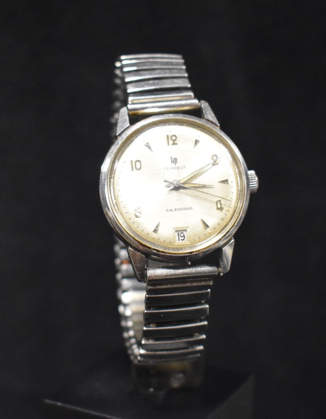 LIP Tempest calendrier: Boitier chromé. Cadran peint. Beau mouvement R23 mécanique à remontage manuel, trotteuse centale et date à 6h. Dimension 34 mm. Vers 1965. Bon état général, mouvement sans accident à réviser.