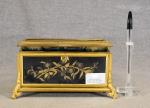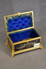 TAHAN (11 Boulevard des Italiens à Paris) : Elégante boîte en bronze de style XVIIIe à décor de feuillage sur fond noir, l'ensemble gainé de bronze (usures, état d'usage), l = 20, 5, p = 13, 5. Signée