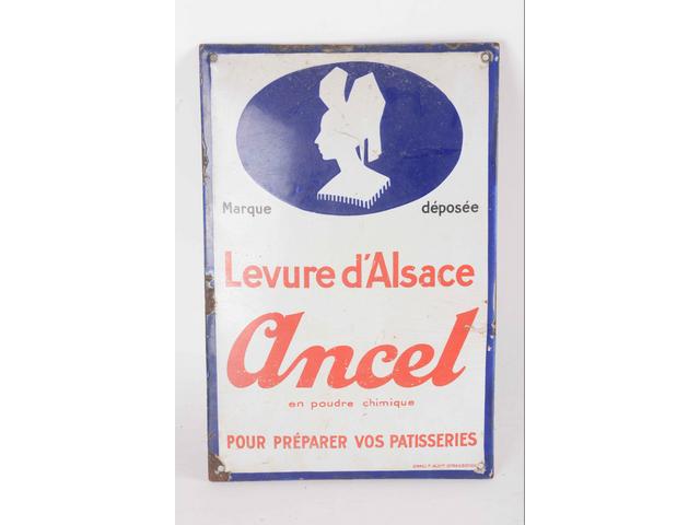 Levure d'Alsace Ancel Plaque émaillée bombée, EAS (frottée, éclats aux fixations). 30x20 cm.