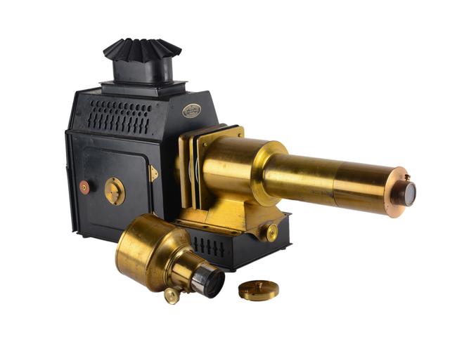 La Bonne Presse Lanterne de projection en tôle noire avec sa cheminée et deux optiques en laiton verni dont un à crémaillère. L. 77 cm.