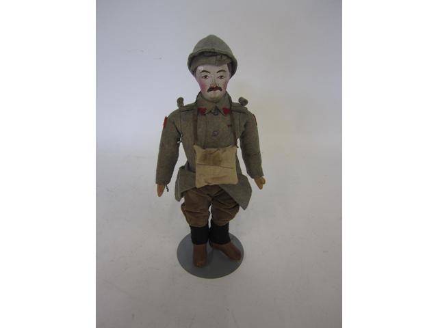 Lot 39 Soldat guerre 14-18 en tenue horizon, tête carton, corps en tissu, beau costume. H. 32 cm. Soldier, WWI Blue uniform, cardboard head, cloth body, good clothing. H. 32 cm.