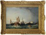 Eugène Modeste Edmond LE POITTEVIN (1806-1870) "Port fortifié avec bateaux" Huile sur toile signée en bas à droite et datée de 1840 (restaurée et rentoilée). 43x65 cm.