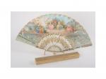 Monture en nacre repercée et dorée à décor d'une feuille peinte d'une scène de genre avec musicienne sur une face et sur l'autre face d'un carquois sur fond de fleurs. Epoque XIXème. Dans une jolie boîte en velours gris rehaussé or.