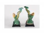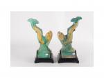 CHINE - Epoque MING (1368 - 1644)Paire de tuiles faitières en terre cuite à glaçure verte et jaune en forme de poissons. (Accidents et manques). H. 30 cm.