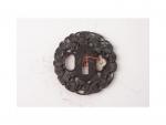 Kawarai gata en fer à décor ajouré en marubori de feuilles d'aoi entrelacées. Signée Echizen no ju Kinai. H.7 cm.