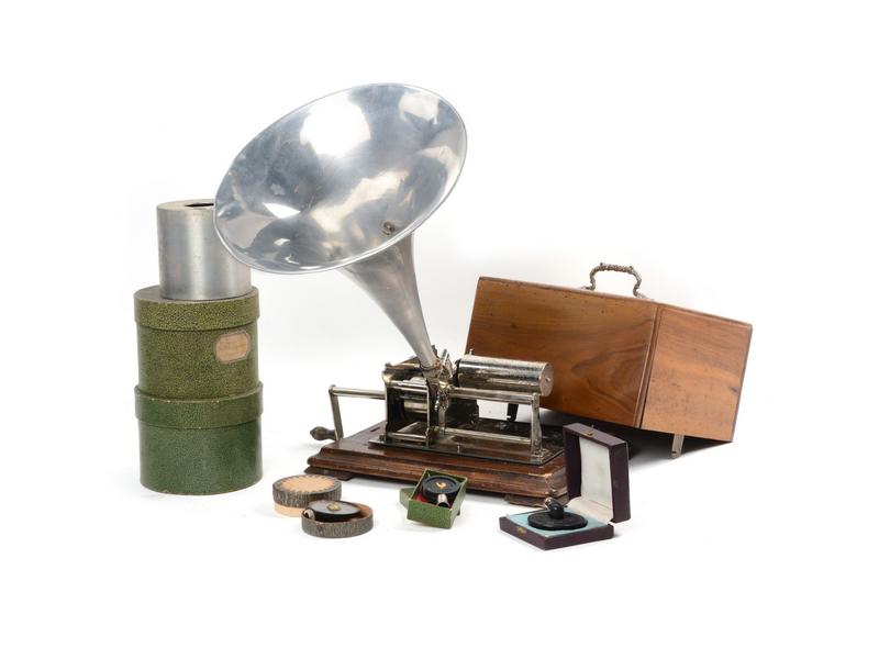 Phono à cylindre Standard et Stentorplatine nickelée avec diaphragme Rex, tête Styx et reproduction Pathé. Pavillon alu, deux cylindres Stentor.