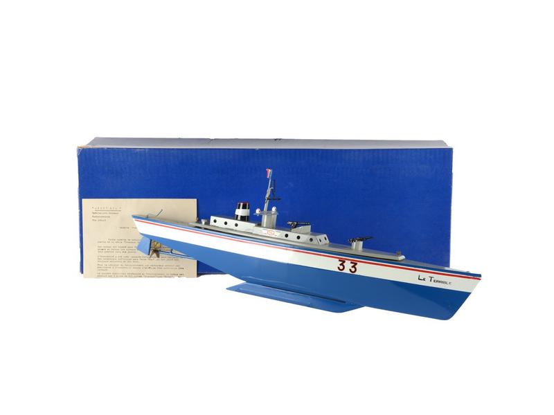 électrique peint bleu et blanc à filets rouges. Etat neuf, en boîte avec notice. 65 cm.