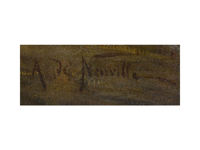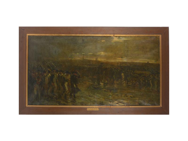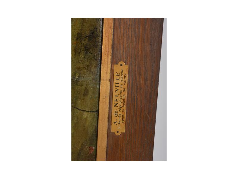 Alfred DE NEUVILLE (XXème)"L'armée républicaine en marche après la bataille de Valmy"Huile sur toile signée en bas à droite. 59x111 cm.