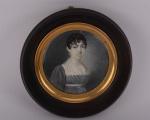 Ecole début XIXe siècle Portrait d'élégante aux boucles de perles. Miniature à vue ronde (insolée). D. 6 cm.