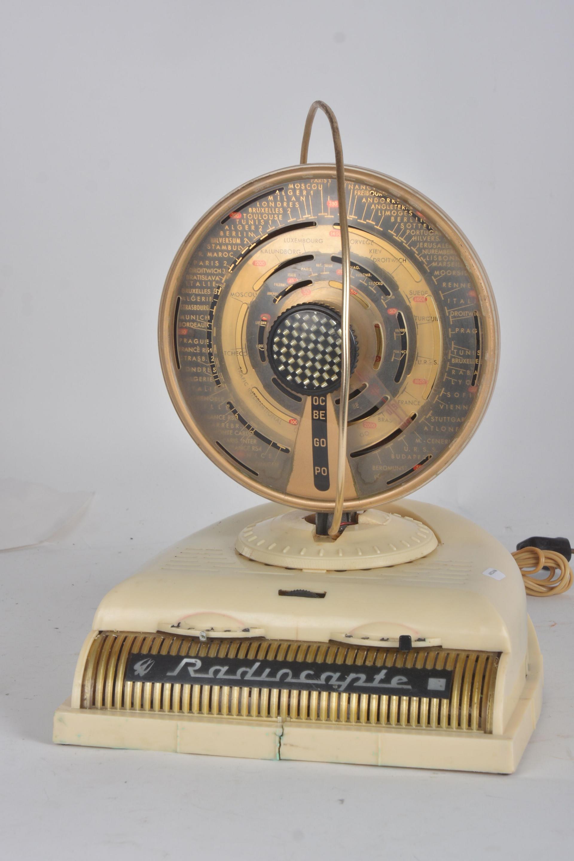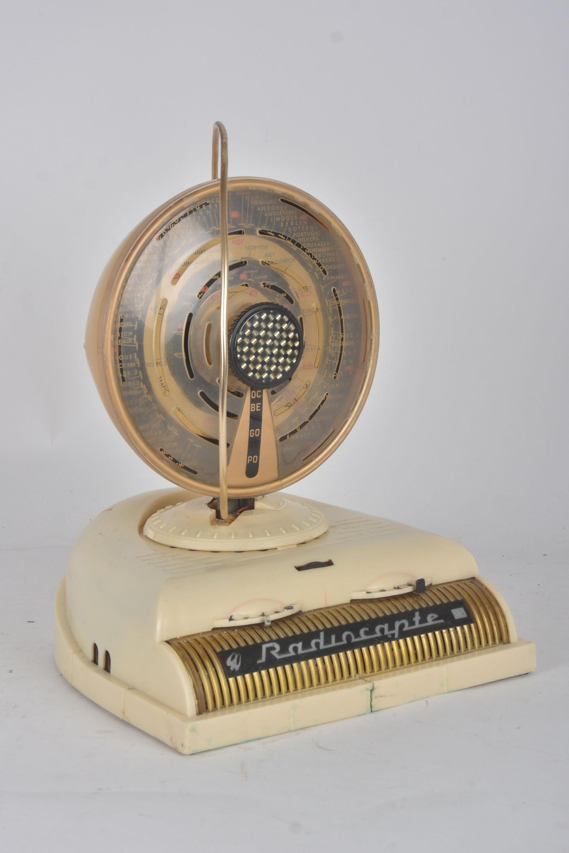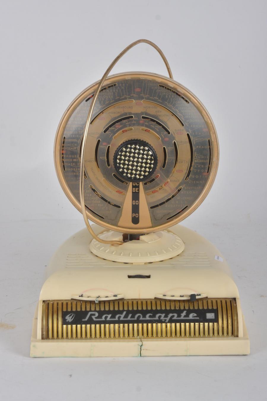 Radiocapte, poste secteur type pendulette en plastique ivoire, fendu sur le socle en façade.