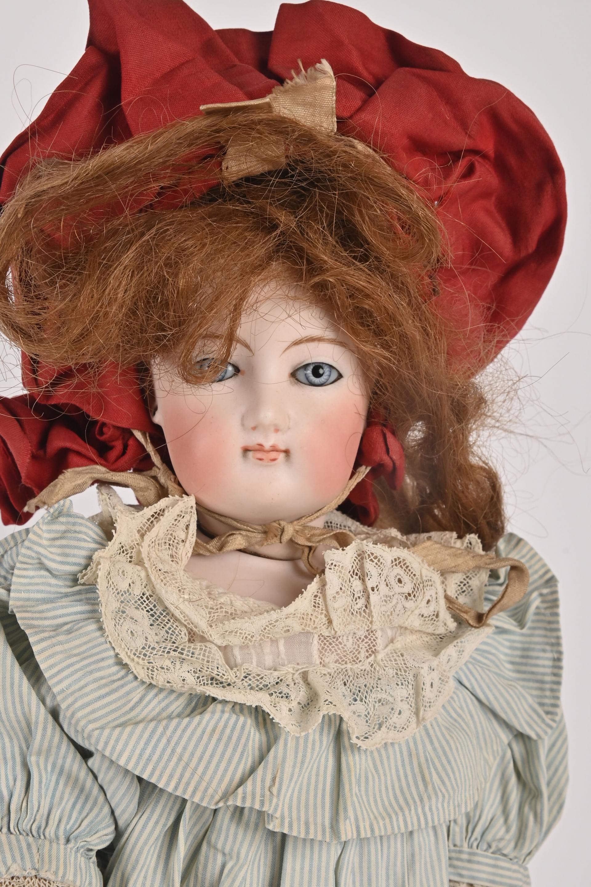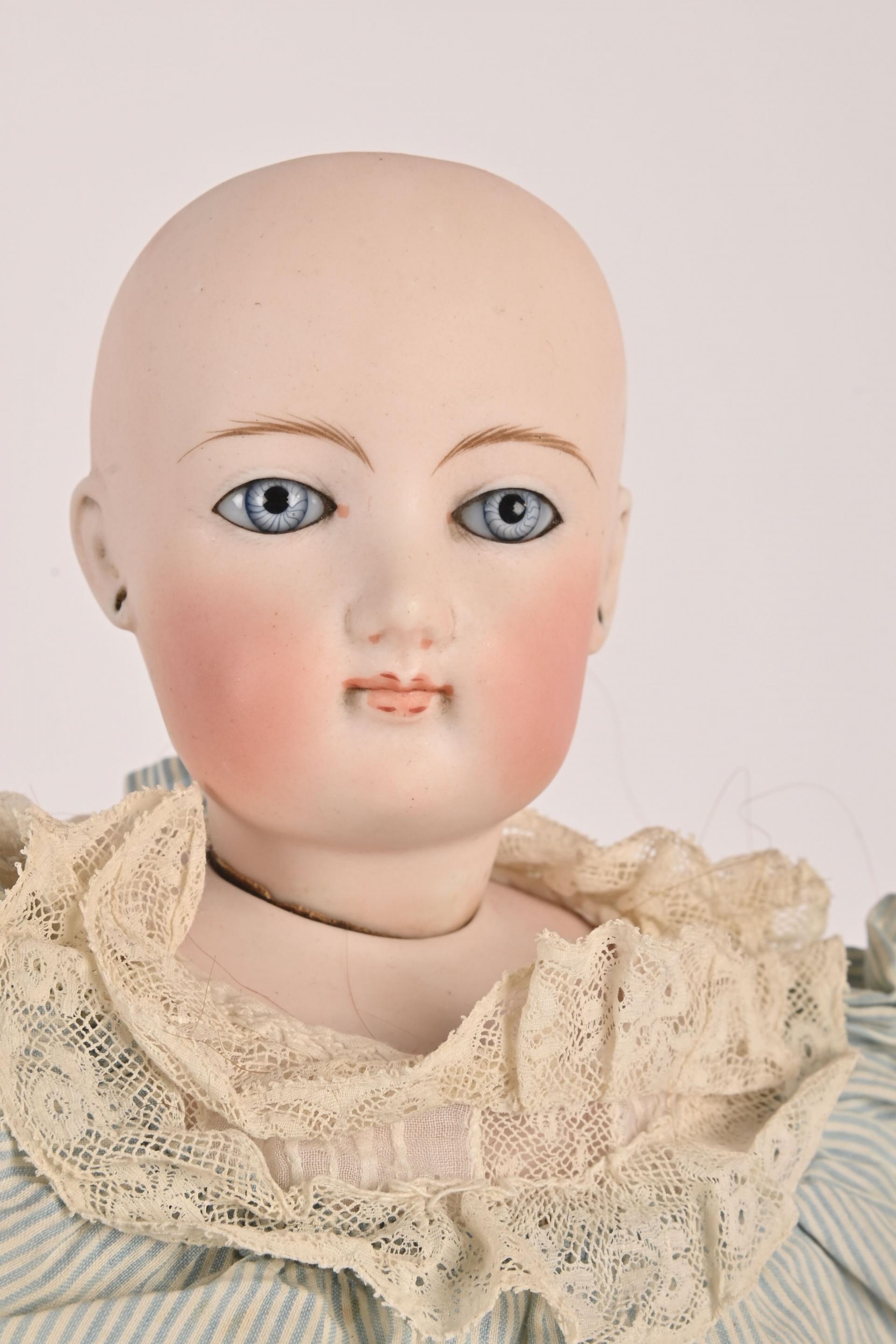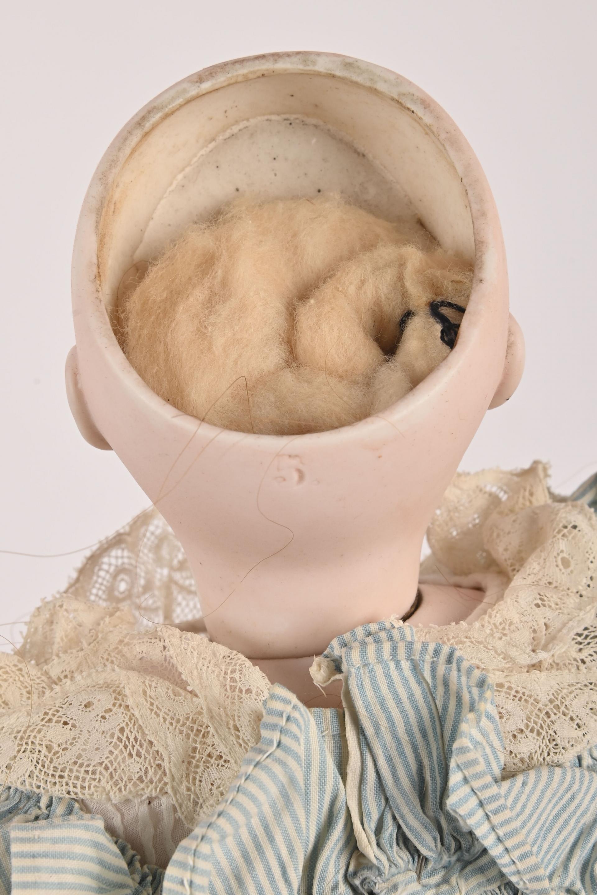 Tête pivotante et collerette en biscuit pressé marquée en creux "5" sur la nuque et "F.G" sur l'épaule gauche, yeux de sulfure bleus à rayons, oreilles percées, corps articulé type Gesland en tissu, mains, jambes et pieds en biscuit, sous-vêtements ,robe et bonnet anciens. 49 cm.