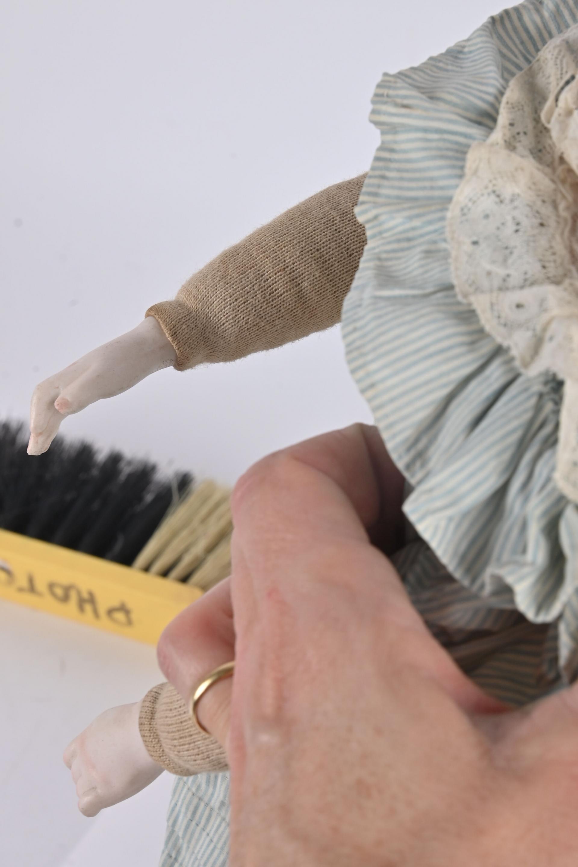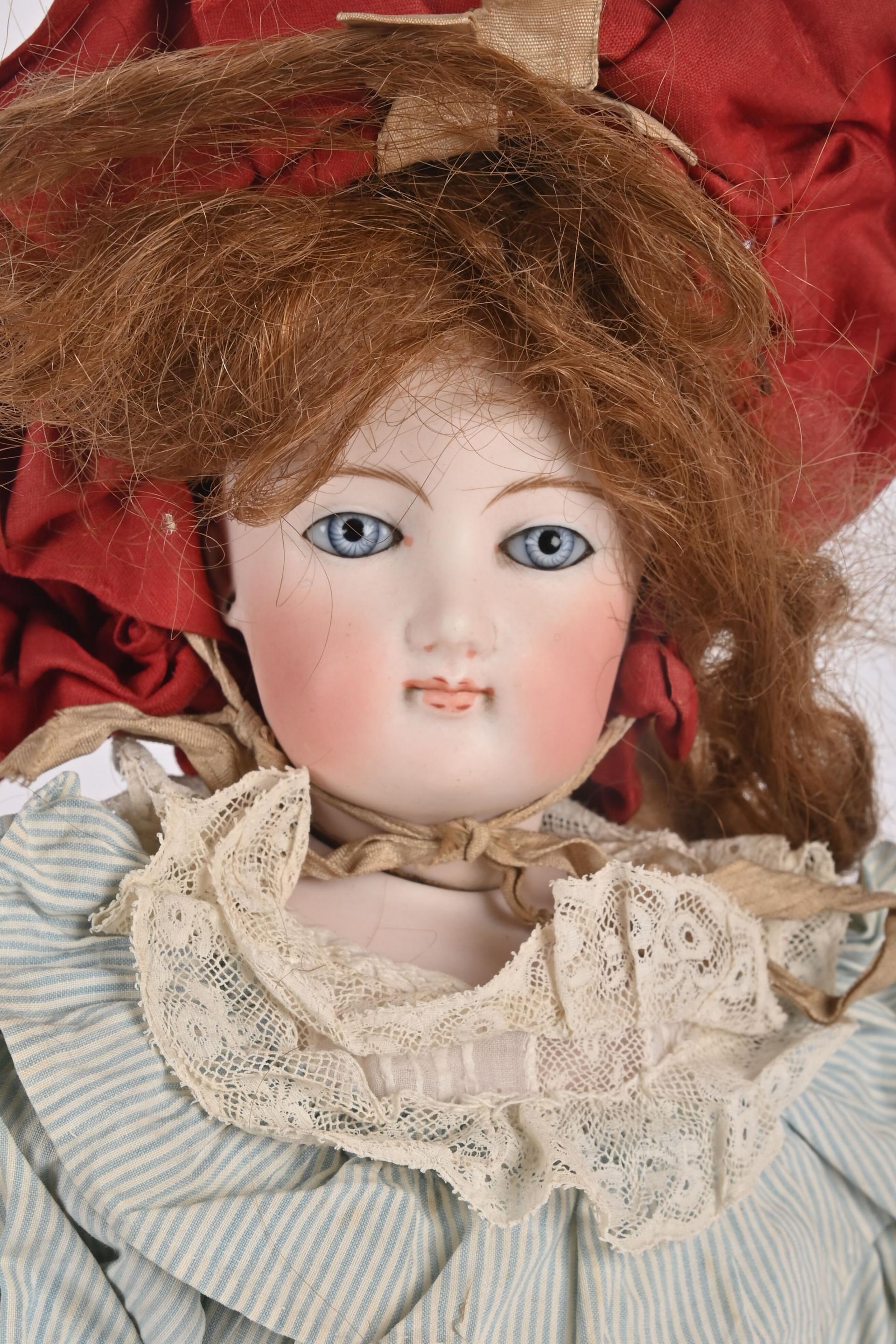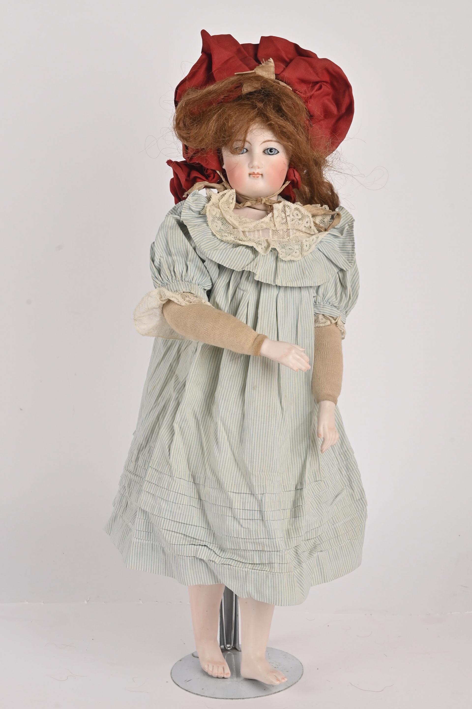 Tête pivotante et collerette en biscuit pressé marquée en creux "5" sur la nuque et "F.G" sur l'épaule gauche, yeux de sulfure bleus à rayons, oreilles percées, corps articulé type Gesland en tissu, mains, jambes et pieds en biscuit, sous-vêtements ,robe et bonnet anciens. 49 cm.