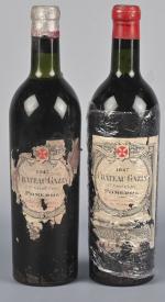 2 bouteilles, Pomerol, Château Gazin, 1947. 1 BG et 1 TBG. Étiquettes très abimées.