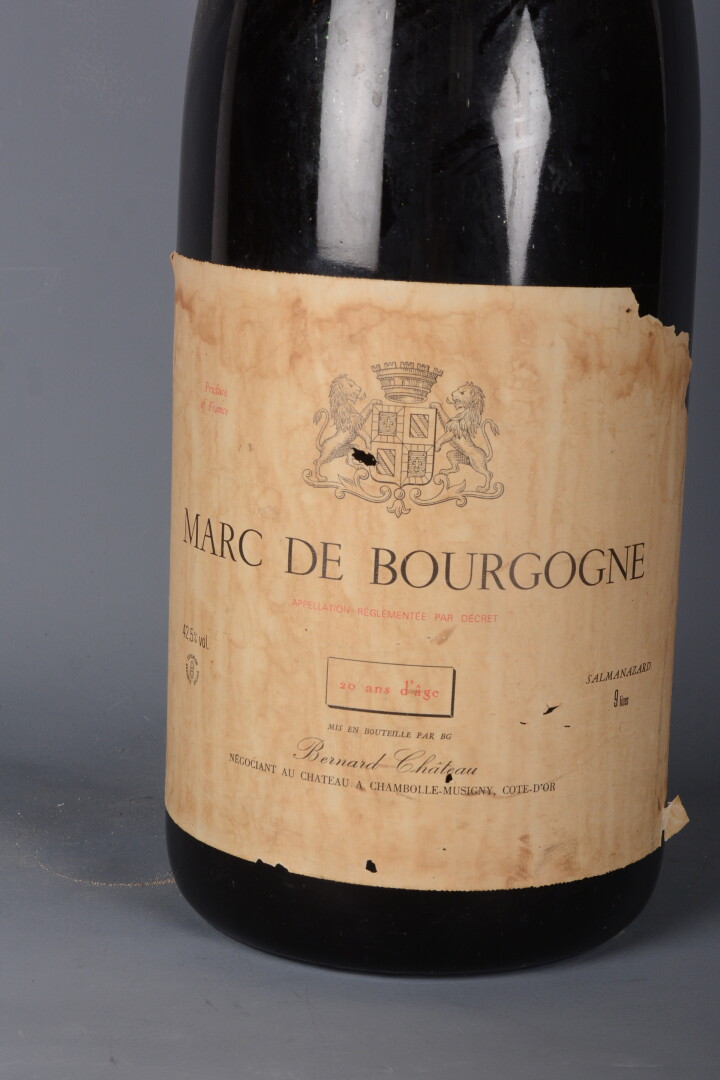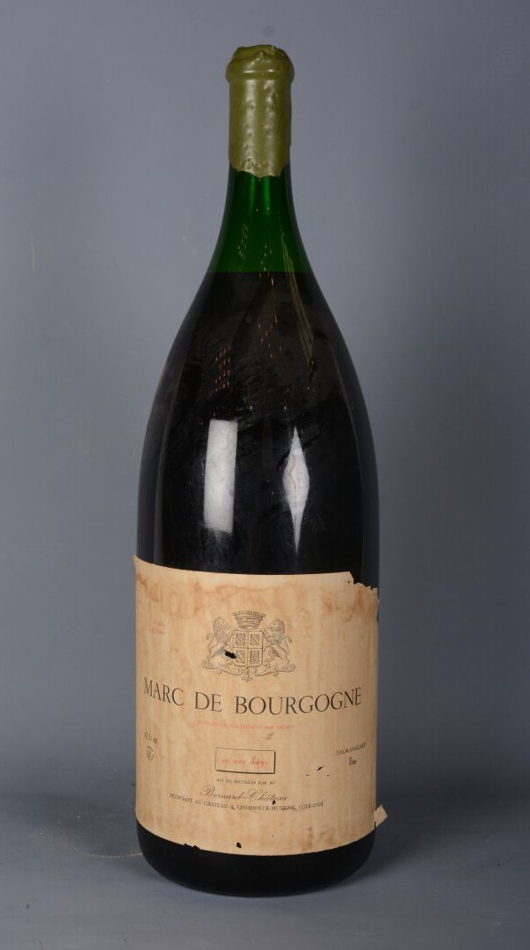 1 salmanazar (flacon équivalent à 12 bouteilles ou 9 litres), Marc de Bourgogne, Bernard Château, 20 ans d'âge. Étiquette sale et dégradée.