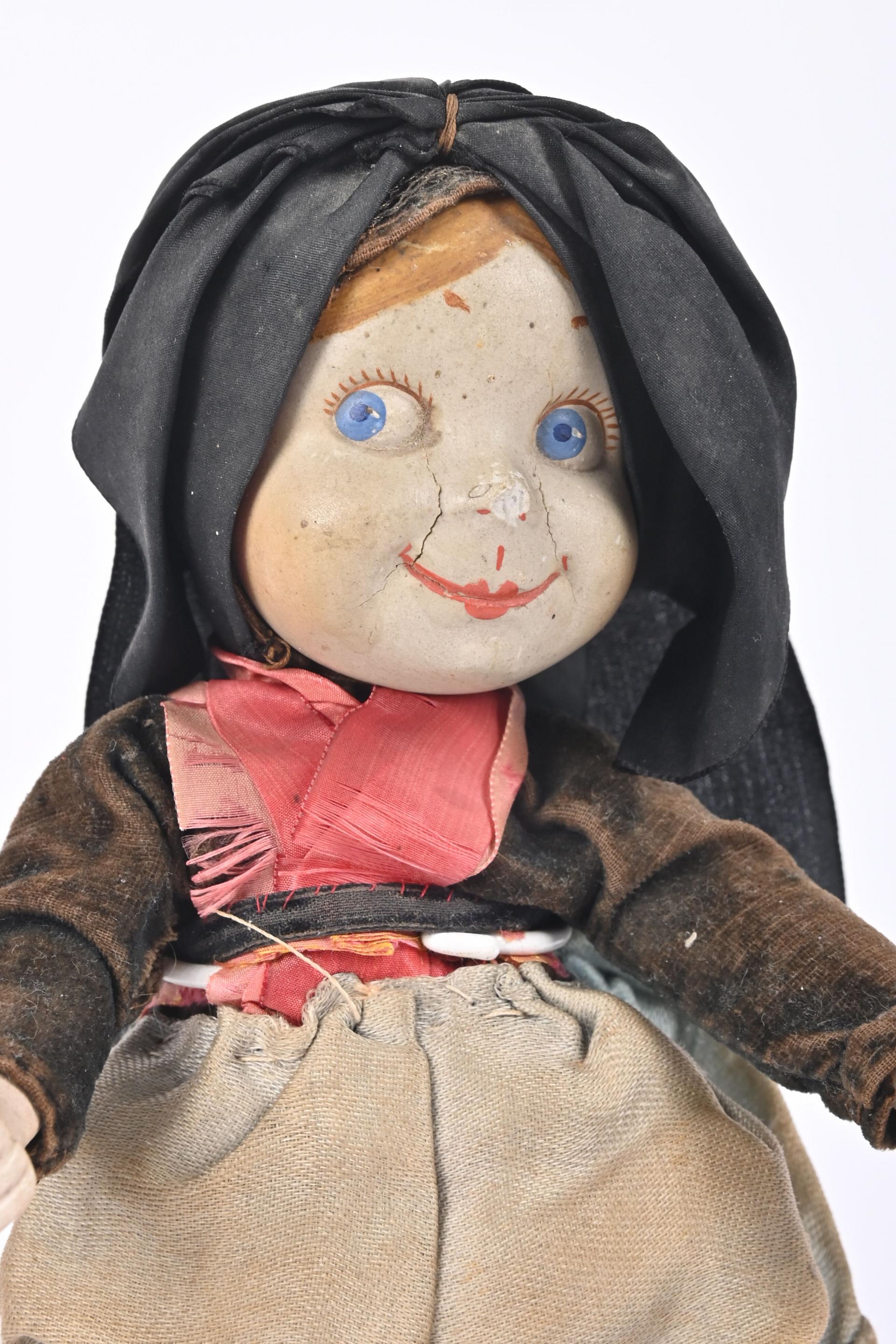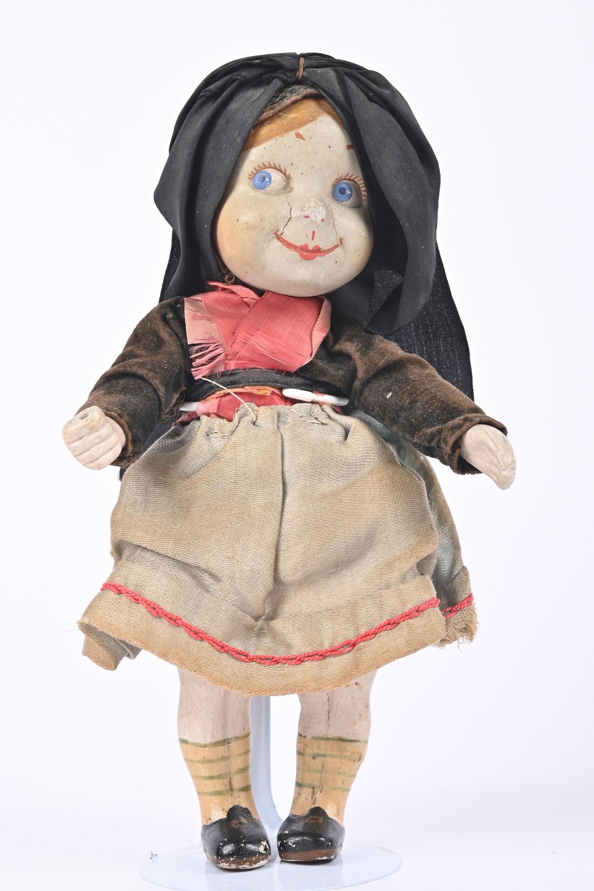 Hansi, poupée alsacienne en composition et céramique, tête marquée "Paris", avec ses habits d'origine. Bel état sauf craquelures de chaque côté du nez. 22 cm.
