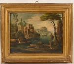 Ecole italienne XVIIIe Bords de mer avec ruines antiques animées Huile sur toile. 32 x 41 cm (manques, écaillures, accidents).
