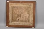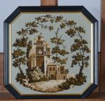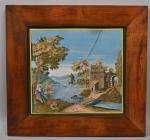 École romantique Bord de rivière animée Broderie sur fond gouaché. (Accident au verre) 21 x 23 cm.