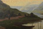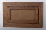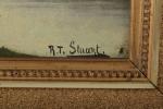 R. T. STUART (XIX) Vallée au pied des collines Huile sur toile signée en bas à droite. 22 x 41 cm. Cadre en pâte dorée d'époque.