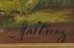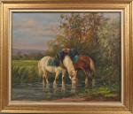 MARTINEZ (Ecole XIXe) Chevaux à l'étang Huile sur toile, signée en bas à droite. 50 x 61 cm.