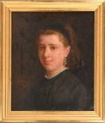 E. VAFRON (Actif à la fin du XIXe siècle) Portrait de femme aux boucles d'oreilles Toile. Dédicacé, signé et daté en bas à gauche A mon vieil ami Julien / E. Vafron / 1872. 47 x 38 cm. Expert : René Millet