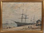 École du fin XIXème - début XXe Voiliers au port Huile sur panneau. 33 x 45 cm.