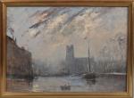 École fin XIXème - début XXe Port dans la brume Huile sur panneau. 33 x 45 cm.