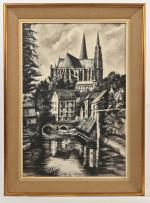 Ecole XXe "Bas-fossé sur l'Eure", Notre-Dame de Chartres vue de la basse ville Encre et lavis d'encre situé en bas et signé en bas à droite. 59 x 40 cm à vue.