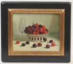 Jacques BLANCHARD (1912-1992) Nature morte au verre et à la coupe de cerises Huile sur isorel, signée en bas à droite (petites usures). 22 x 27 cm.