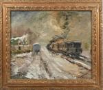 William Marcel CLOCHARD (1894-1990) Train dans la neige ou "Sur une route du Morbihan" Huile sur toile signée en bas à gauche, titrée au dos sur le châssis. 46 x 56 cm.