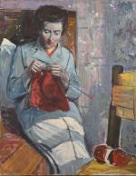 Auguste LIQUOIS (1902-1969) Femme au tricot Huile sur toile non signée. Écaillures. 92 x 73 cm.
