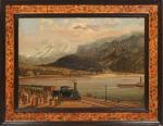 G.BECKE Paysage de bord de lac avec convoi ferroviaire Huile sur toile, signée en bas à droite et datée 1890. 24 x 33 cm (rentoilée).