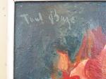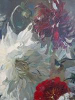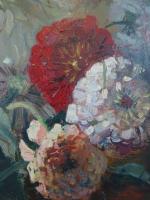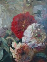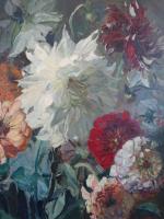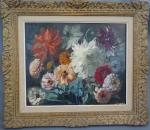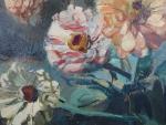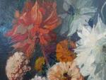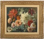Paul Robert BAZE (1901-1985) Dahlias et Zinnias Huile sur isorel, signée en haut à gauche, titrée au dos. (Petits manques dans le bas). 50 x 61 cm.