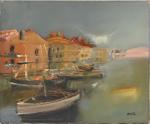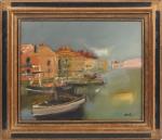 BORLOS (École du XXe siècle) Port calme Huile sur toile signée en bas à droite, titrée au dos sur la toile. 38,5 x 46 cm.