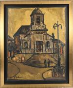 Jef FRIBOULET (1919-2003) Église du Bolbec, 1953 Huile sur toile signée en bas à gauche et datée "53". Cachet au dos et signée. 81 x 64 cm.