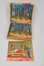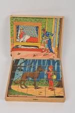 Jeu de cubes "Les contes de Perrault", (usures d'usage). 23,5 x 19 cm.