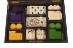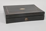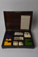 en placage de palissandre et filets de laiton, orné d'une plaque de laiton gravé d'une équerre et d'un compas; il contient dans différents compartiments des sets de jeton en os de différentes couleurs et un jeu de cartes lithographiées avec règle du jeu, complet de sa clé (accidents et petits manques). 6,5 x 30,5 x 22 cm.