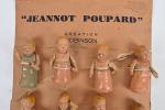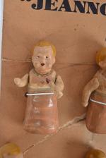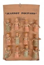 Jeannot Poupard - Création Robinson Douze petits personnages en céramique peinte, bras articulé avec biberon (H. 9 cm). Sur un reste de support de présentation en carton.