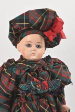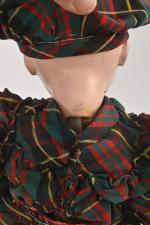 Poupée tête en bois couverte de cire, bouche fermée, yeux de verre bleu, sur un corps semi-articulé plus tardif, habits. 46 cm.