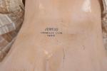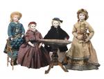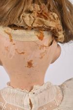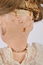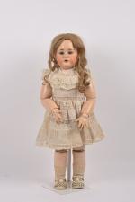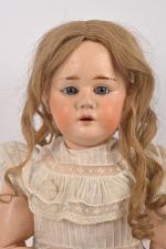 Poupée avec belle tête en composition peinte, bouche ouverte, yeux de sulfure bleu, sur un corps Jumeau médaille d'or tout articulé (deux boules au genou), habits, perruque. 68 cm.
