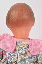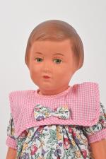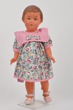 SNF, Françoise de Modes et travaux, fillette en celluloïd, yeux en acétate bleu avec cils, chevelure moulée châtain, corps semi-articulé. 39 cm.