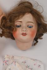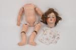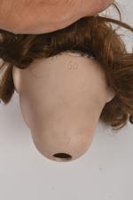 Poupée tête porcelaine Unis France moule 60, taille 7, yeux bleus dormeurs, corps articulé (à rattacher), perruque. 52 cm.