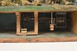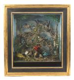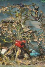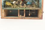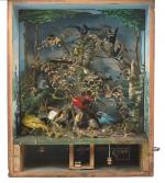 Beau buisson d'oiseaux chanteurs présenté comme un tableau avec cadre et vitre. Quatre oiseaux animés : battant des ailes, sautant de branche en branche, picorant et une cascade. Mécanisme avec poulies en bois et sept cames en laiton. Petites restaurations nécessaires : cordage entre les poulies pour la cascade et soufflet. Vers 1880. Présentation sous cadre, peut être postérieur. Coffret 46 x 24 cm. H. 55 cm. Cadre 61 x 55 cm.