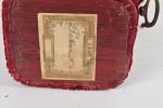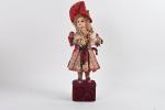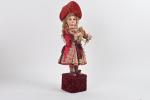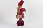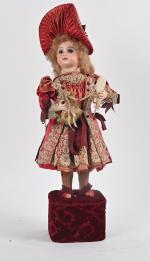 Bel automate en habits de soierie et satin cramoisi-rouge d'origine, superbe chapeau, quatre beaux mouvements : elle embrasse sa poupée et se regarde dans un miroir, mouvements de la tête et des bras, tête Jumeau en biscuit marqué au tampon rouge, taille 4, bouche fermée, yeux de sulfure bleu, mains en biscuit et poupée mignonnette tout en biscuit, musique à un air avec étiquette "Patience n° 6". Vers 1890. H. 55 cm.