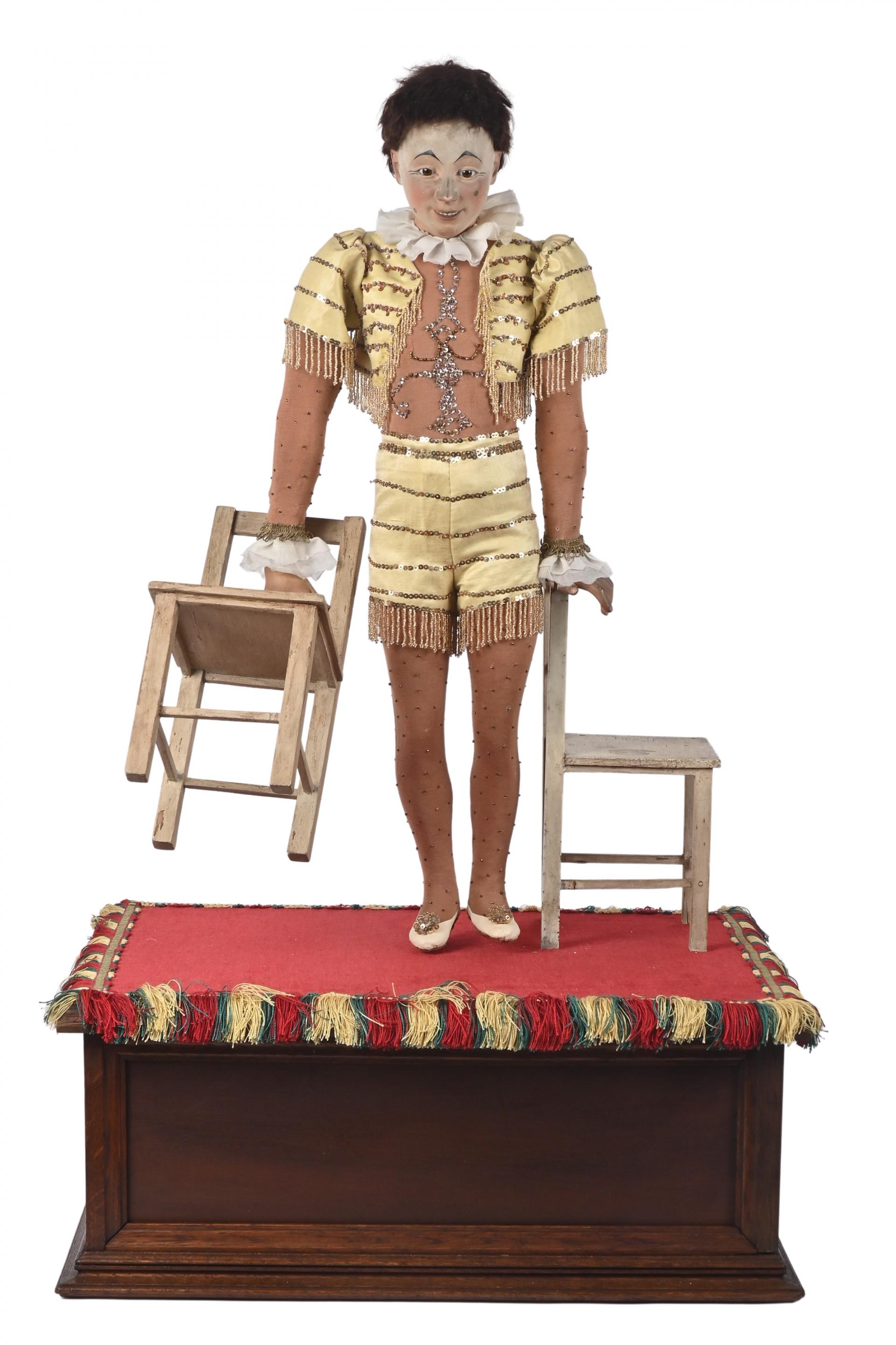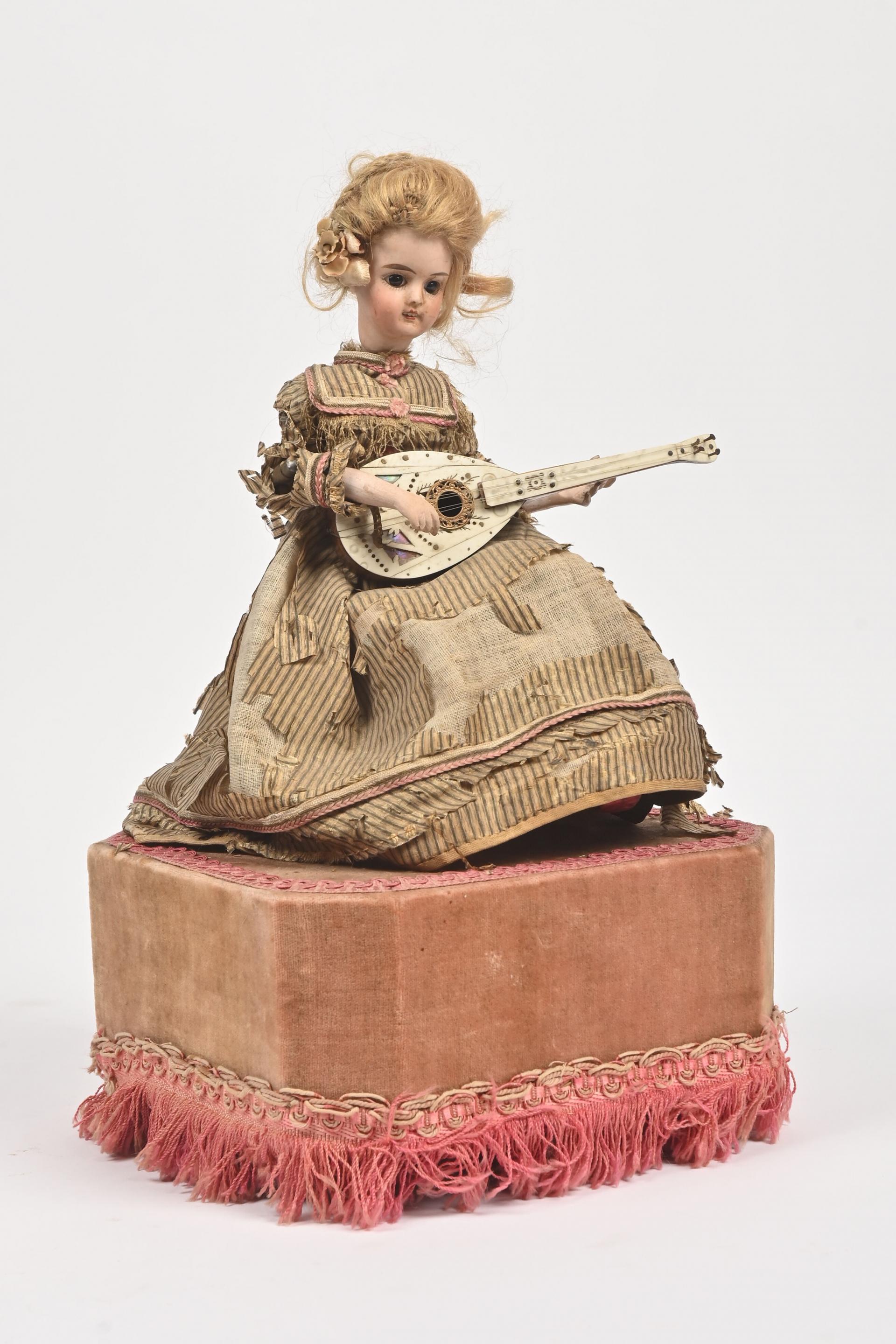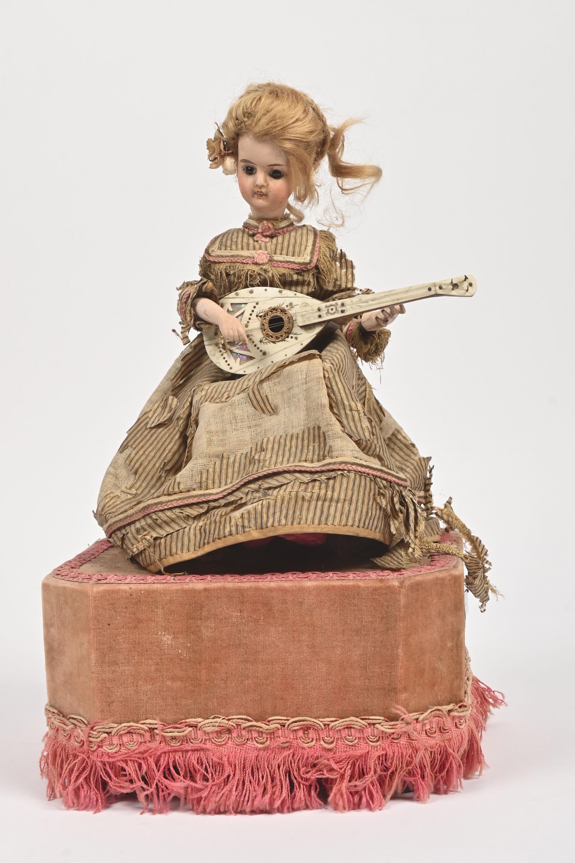 Farkas, joueuse de mandoline Automate à tête et mains en porcelaine, mouvement de la tête, du bras droit et des pieds. Musique. Vers 1970. H. 37 cm.